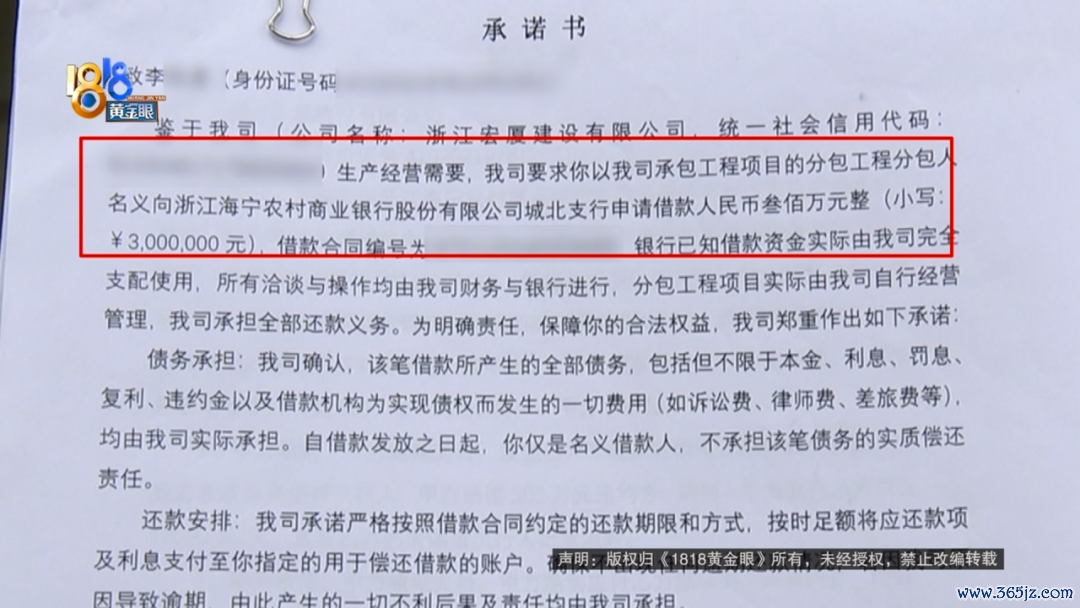 让老板签下了承诺书,说是“鉴于公司生产经营需要,公司要求李先生以分包工程分包人名义,向浙江海宁农村商业银行股份有限公司城北支行申请借款人民币300万元。