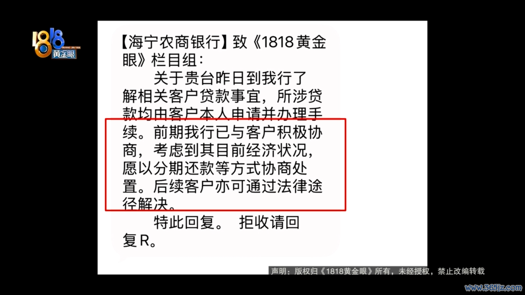 海宁农商银行方面回复,所涉贷款均由客户本人申请并办理手续,前期已与客户积极协商,考虑到其目前经济状况,愿以分期还款等方式协商处置,客户也可以通过法律途径解决。