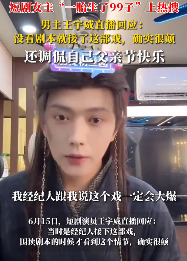 “1胎99子”的剧情出自短剧《麒麟送子天降喜福》,根据剧情,女主意外怀上“龙种”,并在临盆时出现麒麟踏云送子的超自然现象,最终诞下99个孩子。