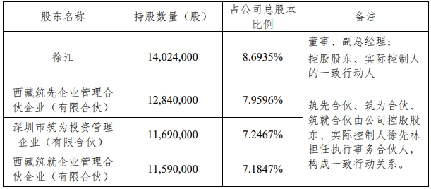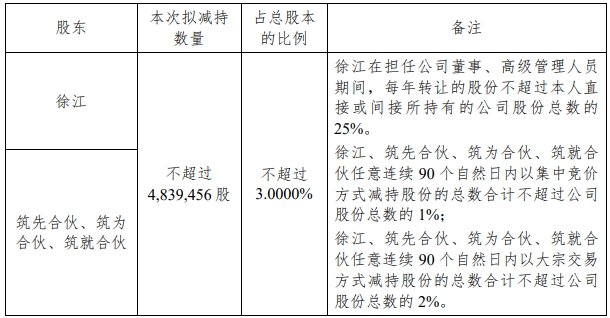 徐江在担任公司董事、高级管理人员期间,每年转让的股份不超过本人直接或间接所持有的公司股份总数的25%。 徐江、筑先合伙、筑为合伙、筑就合伙任意连续90个自然日内以集中竞价方式减持股份的总数合计不超过公司股份总数的1%; 徐江、筑先合伙、筑为合伙、筑就合伙任意连续90个自然日内以大宗交易方式减持股份的总数合计不超过公司股份总数的2%。