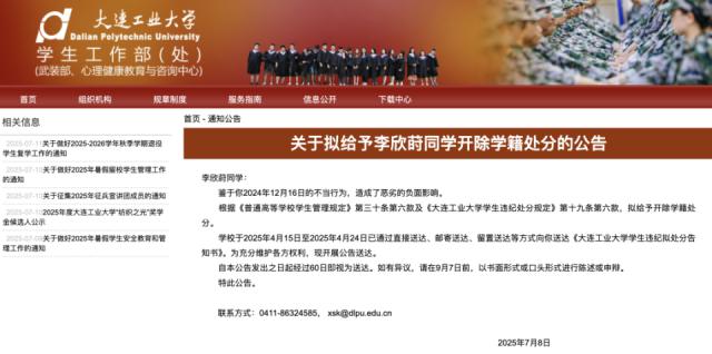 近日,大连工业大学学生工作部(处)网站发布《关于拟给予李欣莳同学开除学籍处分的公告》: