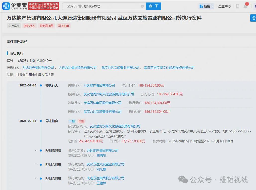 据企查查APP,案件流程显示,万达集团、万达地产集团有限公司等此前因案件被强制执行1.86亿元。执行法院,是甘肃省兰州市中级人民法院。